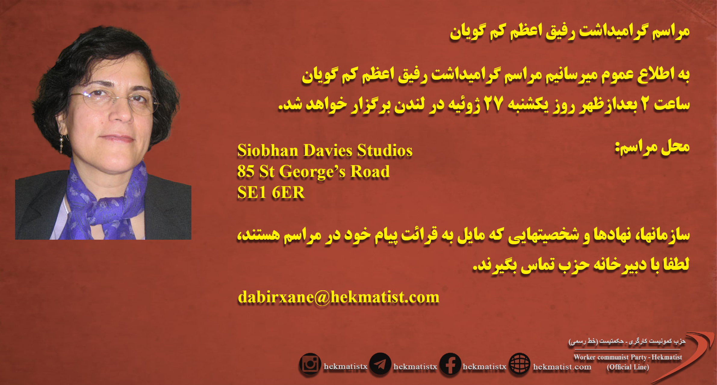 - روز ۲۷ ژوئیه مراسم بزرگداشت رفیق اعظم کم گویان در لندن برگزار شد. تصاویری از این مراسم به همراه فیلم کامل مراسم را در زیر مشاهده میکنید: